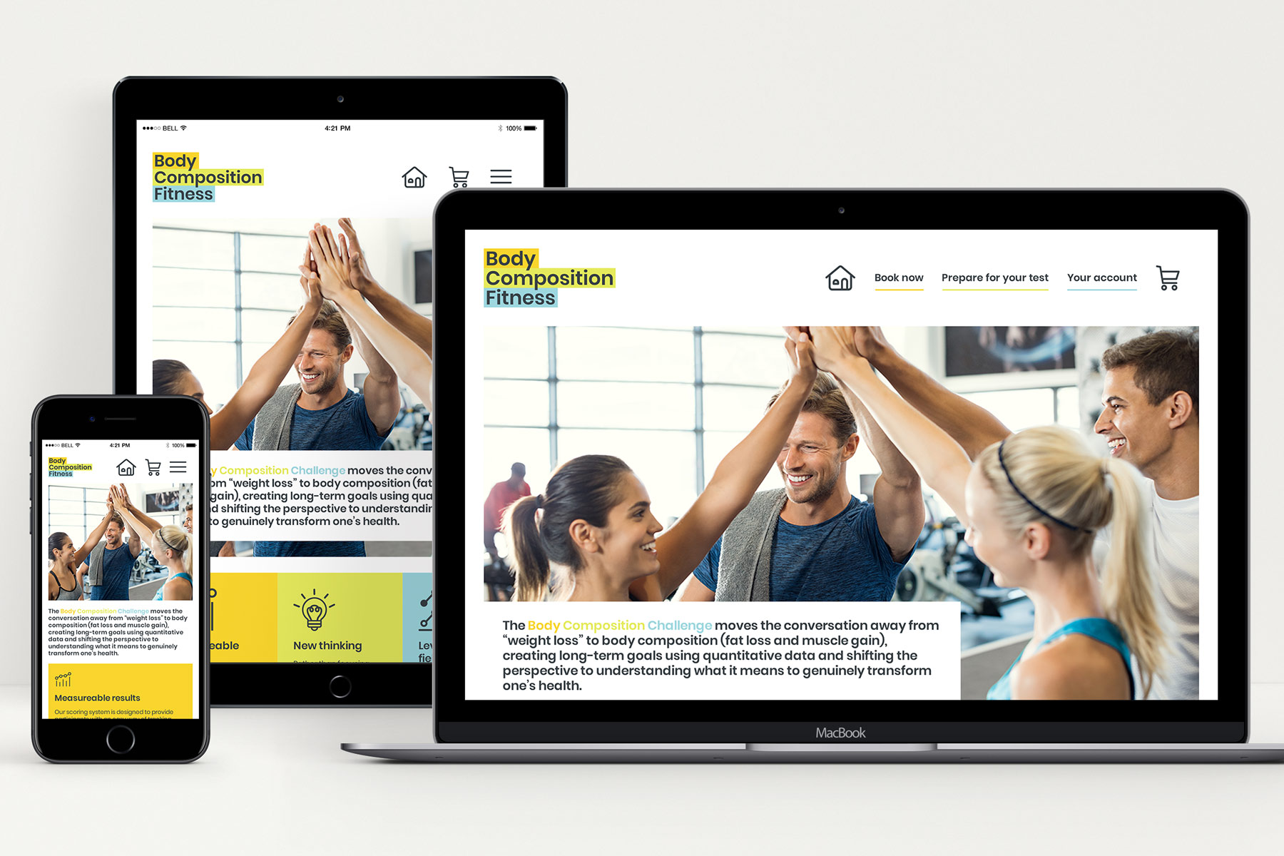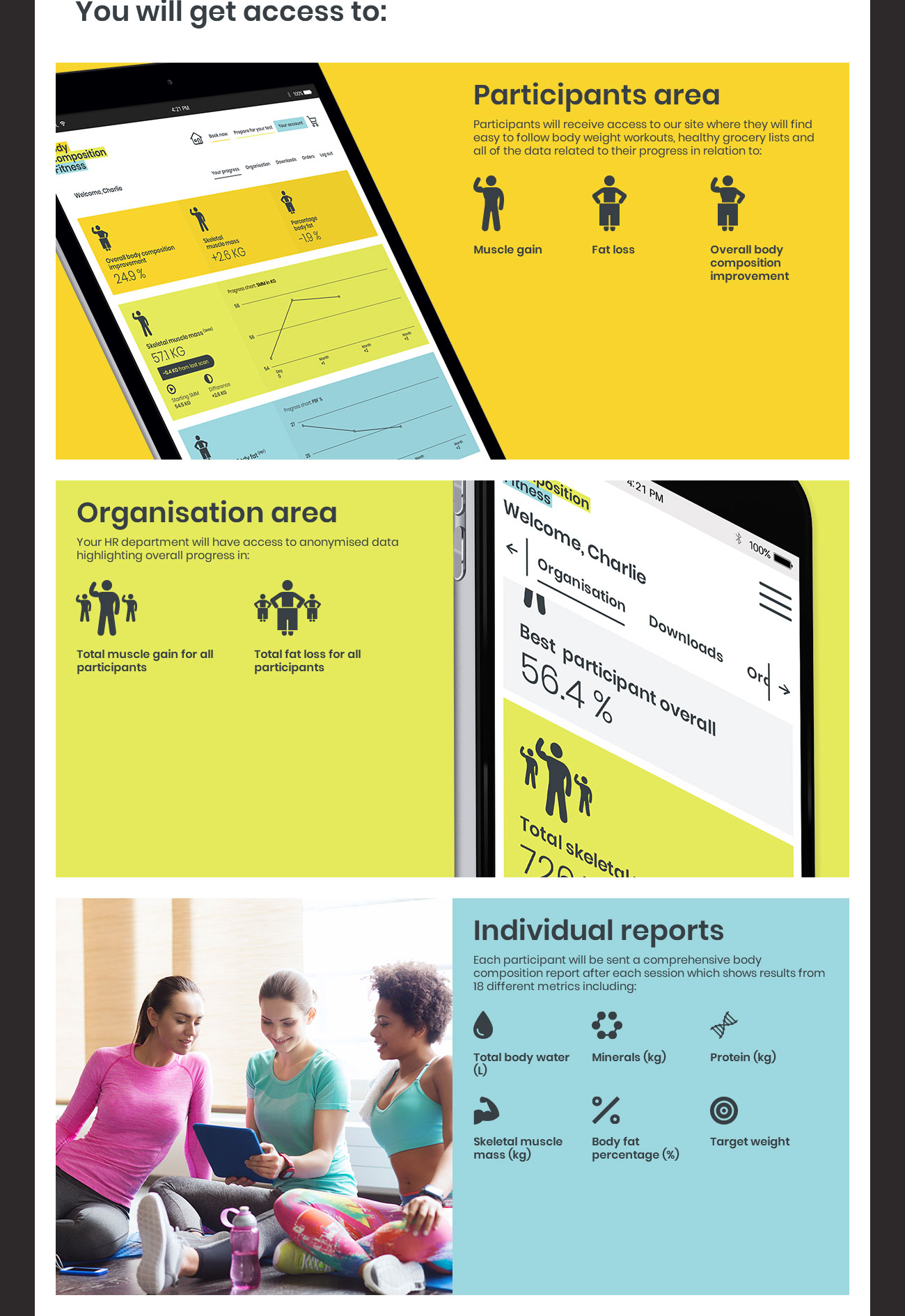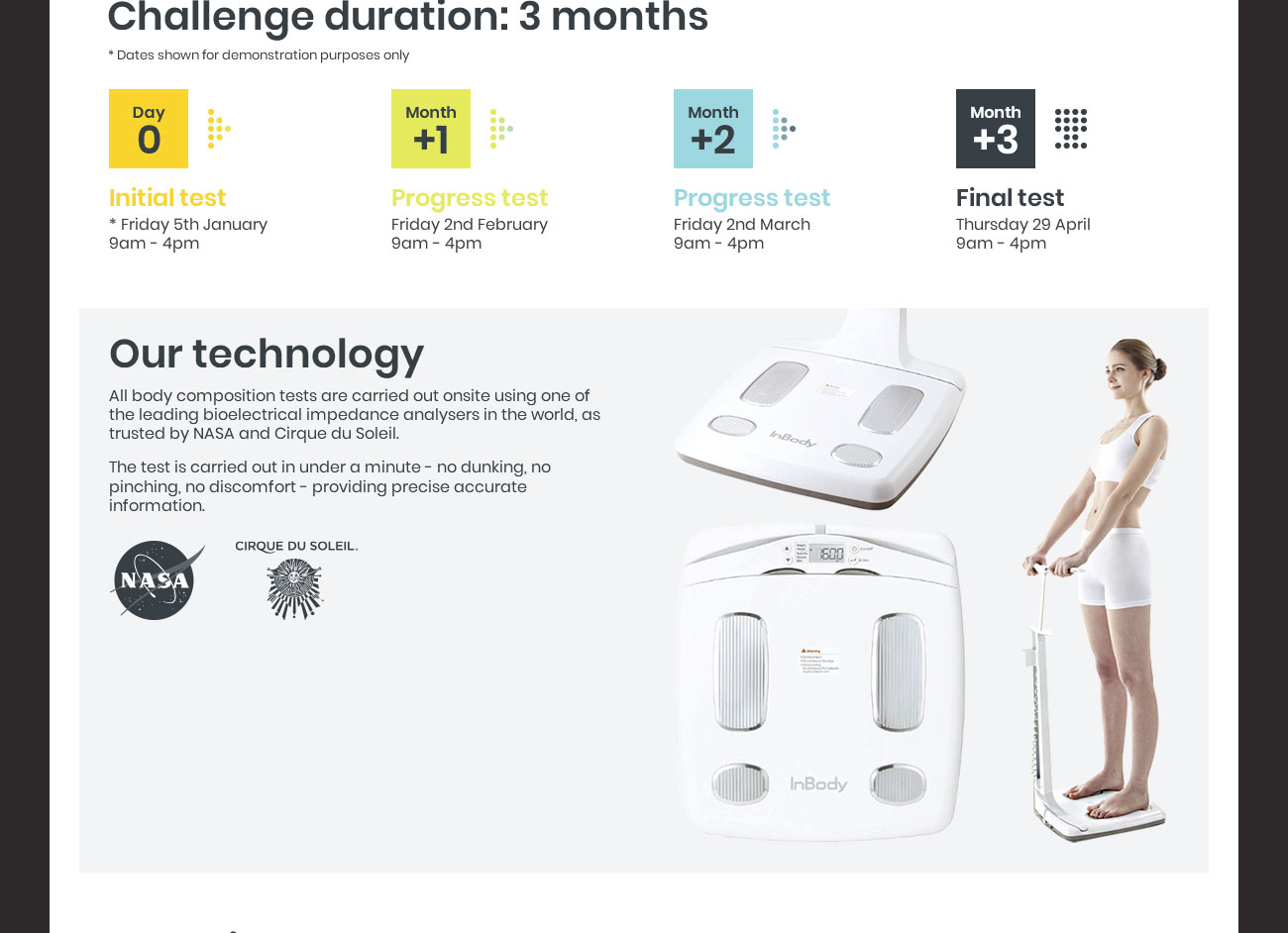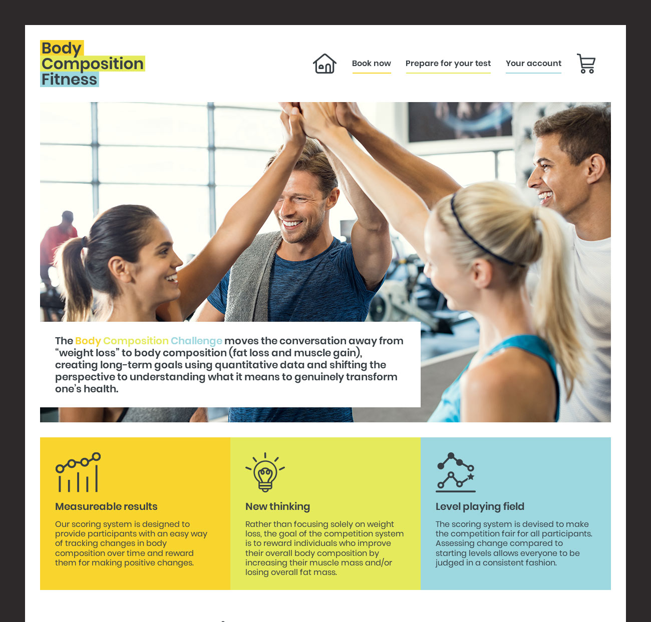 The top menu is simple, targetting bookings and the three box structure beneath the main image breaks down the body composition message and discusses the use of the service within a business environment. After the initial explanation, the user is then shown more details about the service process and the technology used to evaluate participants.