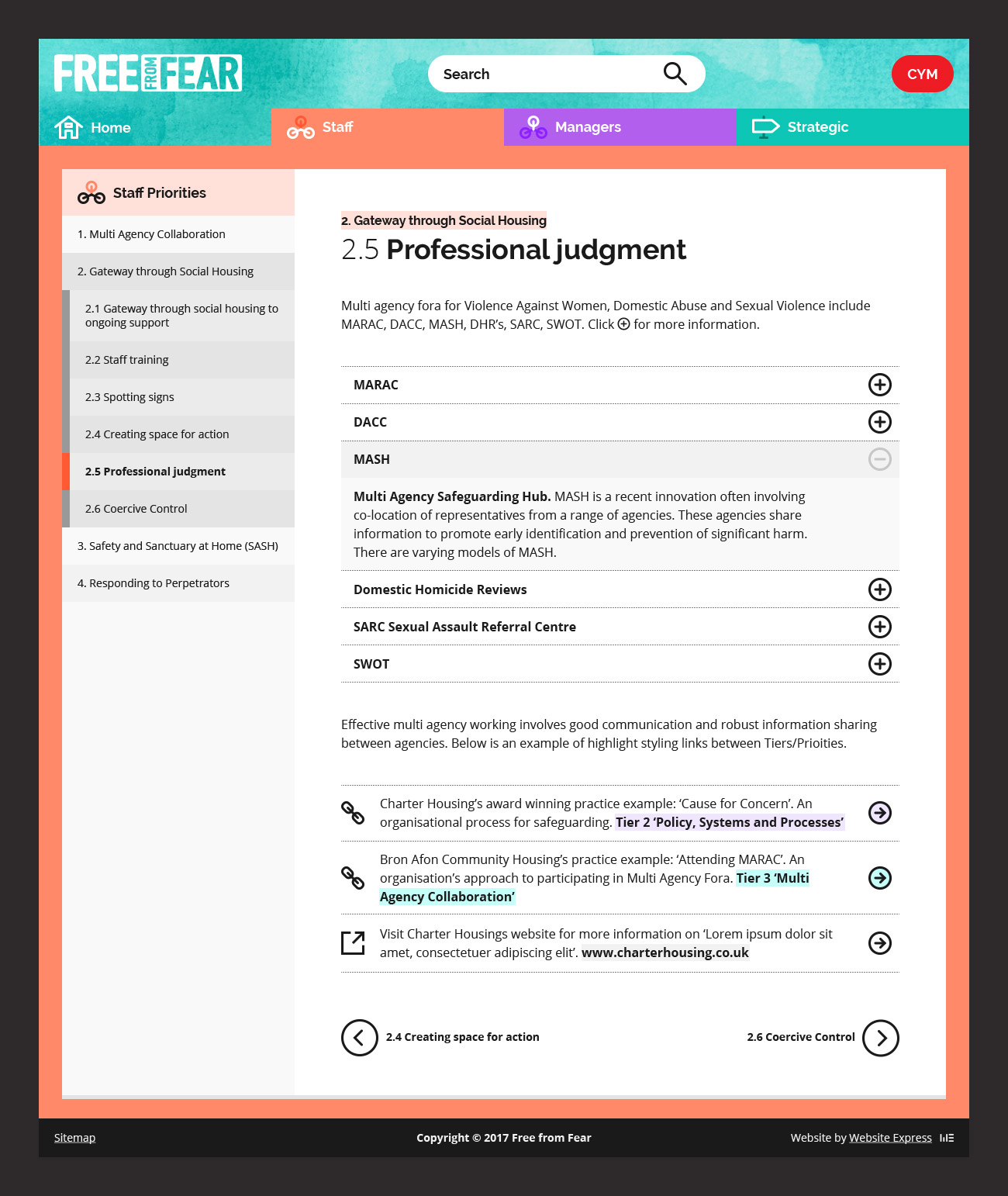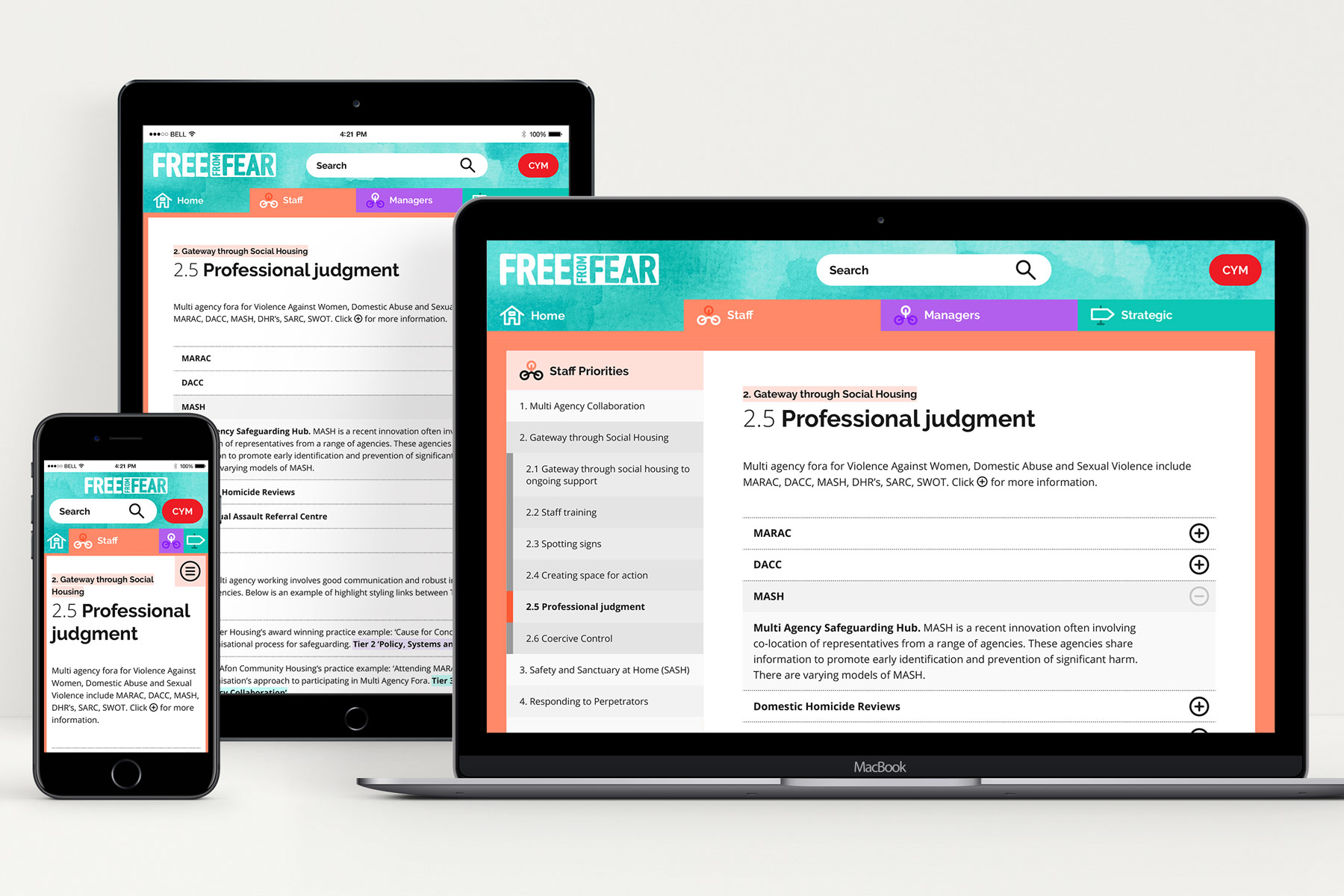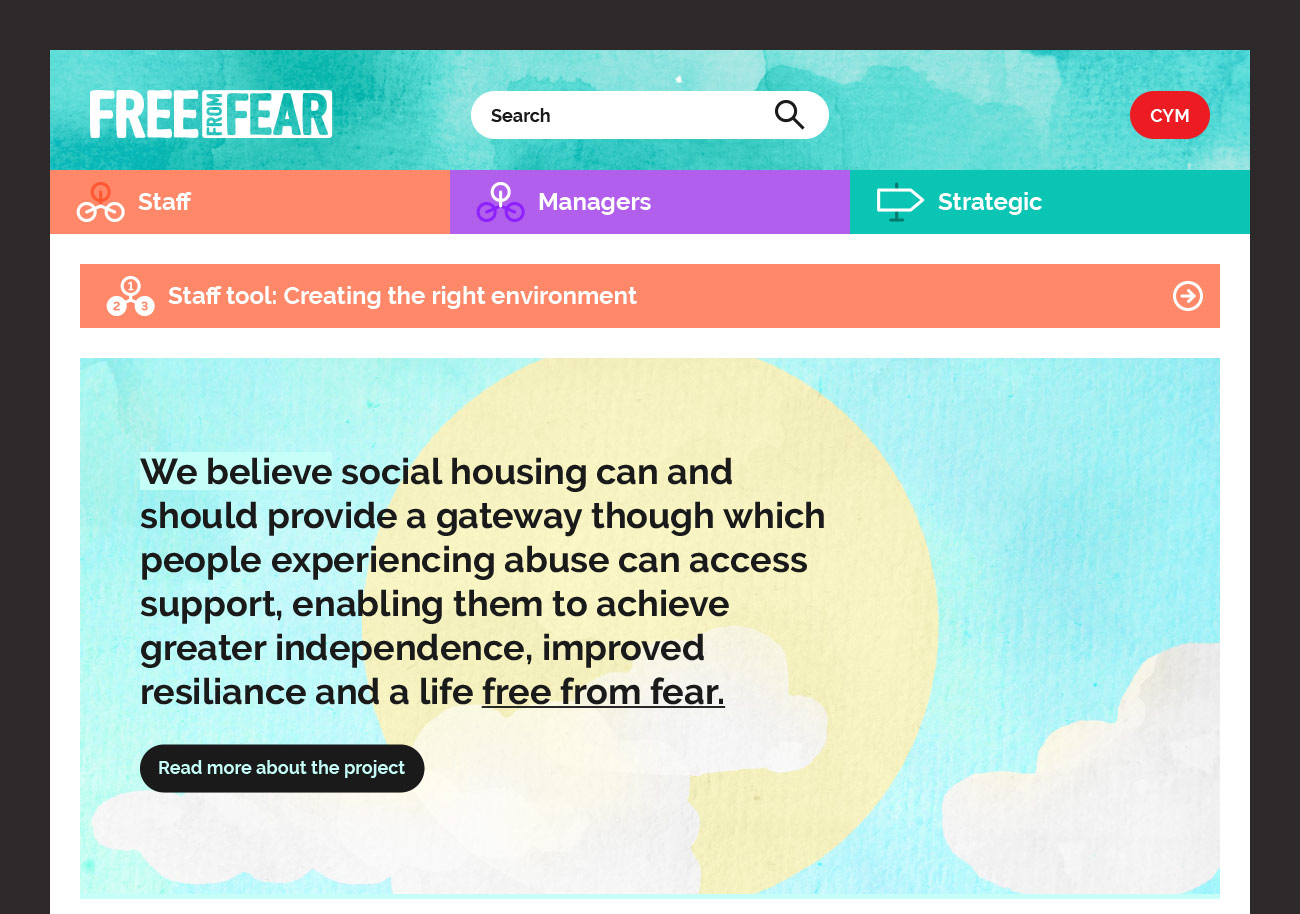 Free from Fear was established in 2014 when a Gwent group of social landlords came together to improve responses to domestic abuse within social housing. In 2017 I was asked to design the user experience for an information resource that operational housing staff could use to quickly respond in the correct manner to those experiencing or perpetrating Domestic Abuse.